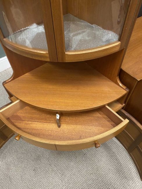 MID-CENTURY TEAK LOUNGE FURNITURE two items comprising sideboard, three central opening drawers, flanking twin cupboard doors, tapering supports, 73.5cms (h), 153cms (w), 45cms (d), Nathan glass top corner display unit, open top shelf, bow front glazed double doors, interior glass shelves, two lower drawers, two cupboard doors, 194cms (h), 75cms (w)Provenance: private collection Gwynedd