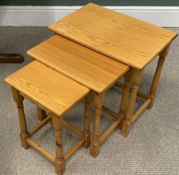 MODERN PINE FURNITURE comprising oval top dining table, bulbous column, tripod base, 75.5cms (h), 143cms (w), 90cms (d), circular coffee table, 46cms (h), 75cms diam, nest of three occasional tables, 48cms (h), 51cms (w), 35cms diam the largest, small side table, turned and block supports, 45cms (h), 41cms (w), 40cms (d), small stool with circular top, four turned supports, X stretcher, 23.5cms (h), 20cms top diamProvenance: private collection Flintshire