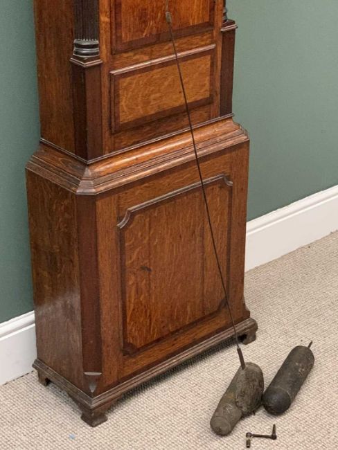 STAFFORDSHIRE LONGCASE CLOCK circa 1830, oak and mahogany, enamelled dial by J N Smith, Leek, Roman numerals, circular dial, eight day pendulum driven twin weight bell strike movement, (pendulum and weights included) 234 (h) x 58 (w) x 23cms (d)Provenance: private collection Stoke-on-Trent