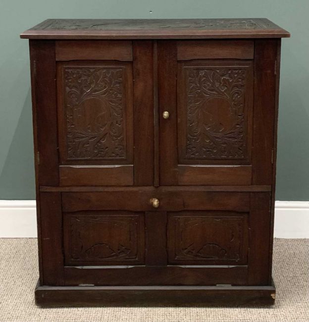 CARVED HARDWOOD STORAGE CUPBOARD, leaf/rabbit top and front panels detail, twin cupboard doors, lower drop-down front cupboard door, turned brass knobs, plinth base, 99cms (h), 87cms (w), 39cms (d)Provenance: private collection Conwy