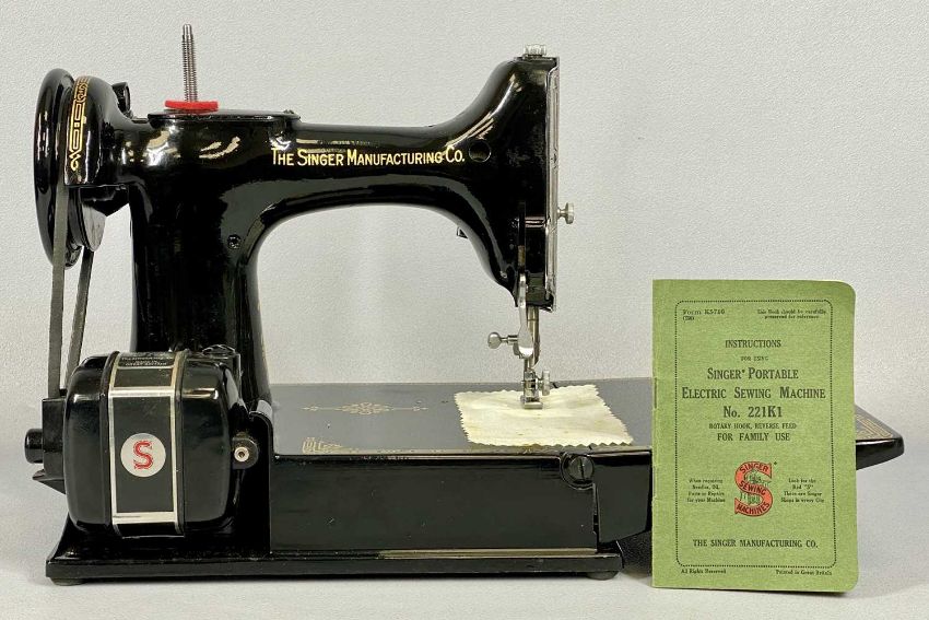 221K SINGER PORTABLE ELECTRIC SEWING MACHINE, original foot pedal, original case, instruction booklet and associated itemsProvenance: private collection Conwy