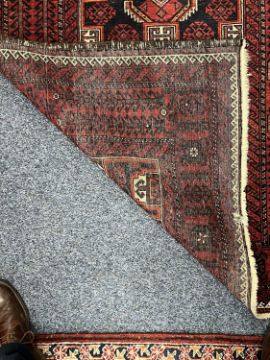 PERSIAN RED GROUND HANDMADE WOOL RUG, triple medallion centre, geometric border, 196 x 300cmsProvenance: deceased estate Conwy