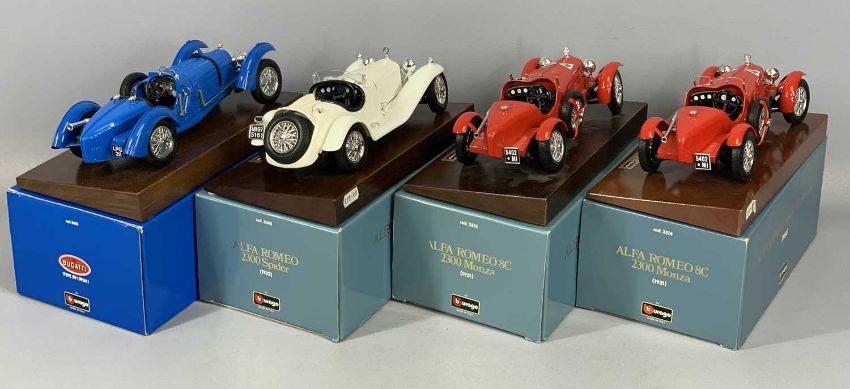 BURAGO 1/18 SCALE DIECAST SPORTS CARS, 43508 Alpha Romeo 2300 Spider (1932), 2x 3514 Alpha Romeo 8C 2300 Monza (1931) and 3505 Bugatti Type 59 (1934), all boxedProvenance: private collection Conwy