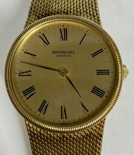RAYMOND WEIL GOLD PLATED INTEGRAL BRACELET WRISTWATCH, gold colour dial, Roman numerals, 30mm (case diam.), apparently in working order when listed, no guarantee, original protective pouch, numbered 7019 to the case backProvenance: private collection Conwy