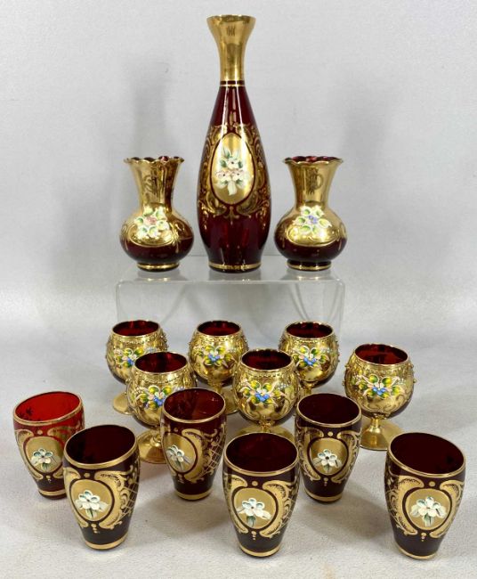 VARIOUS GLASSWARE, including Czech-Bohemian gilded and painted vases a pair, 10cms (h), taller vase 13cms (h) and various liqueur glasses and three boxed Caithness paperweightsProvenance: private collection Ynys Mon