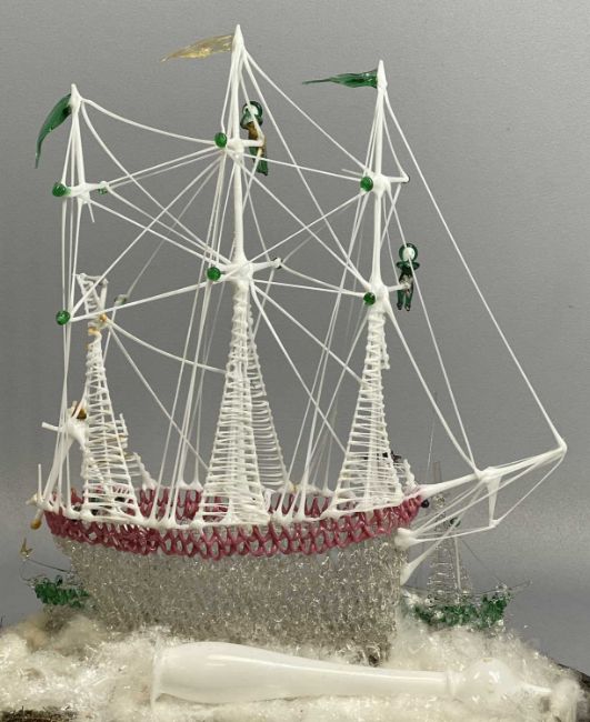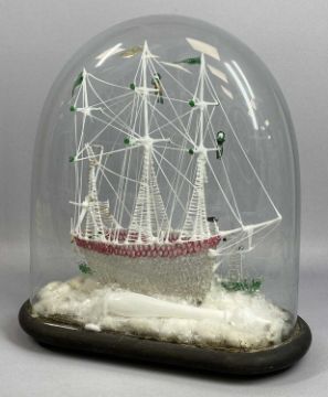VICTORIAN GLASS FRIGGER & DISPLAY DOME, in the form of a three-masted sailing ship with smaller ship and lighthouse, under glass dome and on wooden base, 39cms (h)Provenance: deceased estate Gwynedd