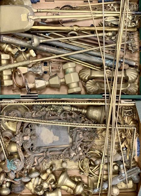 ANTIQUE & LATER BRASSWARE COLLECTION, to include fireside items, bell weights, door furniture, photograph frames and other items of interest, within two boxesProvenance: private collection Conwy