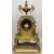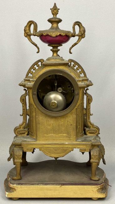 FRENCH GILT METAL SEVRES STYLE PORCELAIN CLOCK GARNITURE, late 19th century, the hand painted panels decorated with figures and landscape, clock with eight-day movement striking on bell, the side vases with glass domes, 43cms (h) inclusiveProvenance: deceased estate Gwynedd