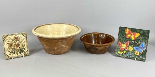 MID 19TH CENTURY POTTERY GROUP, slip glazed terracotta dairy bowl, 34cms (diam.), Buckley-type slipware dairy bowl, 24cms (diam.), ten Art Nouveau slip glazed floral tiles, 15cms square and three other tilesProvenance: deceased estate Conwy