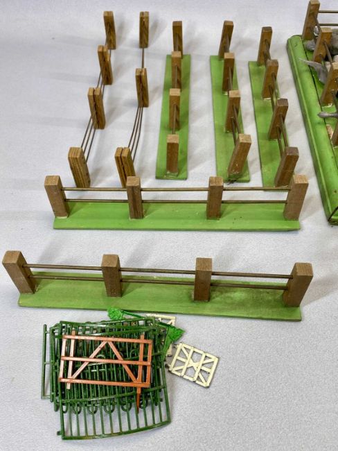 A VINTAGE TOY FARM, rectangular painted wooden field with fence, 53 x 34cms, nine other sections of fencing, various outbuildings and a large collection of painted lead animals and other figuresProvenance: private collection Denbighshire