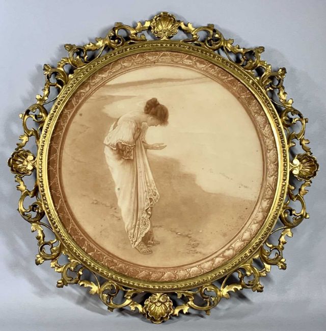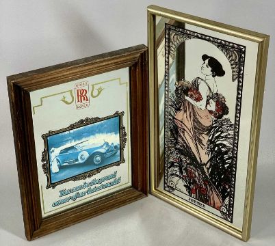 UNKNOWN circular colour print - Classical female in an ornate giltwood frame, carved with scrolls, leaves and shells, 68cms diam., overall, oval wall mirror in wood effect moulded frame, 74 x 46cms, rectangular oak tea tray with painted metal gallery and turned wooden side handles, 64 x 41cms overall, rectangular tea tray with floral silk work panel, 53.5 x 19.5cms, Rolls Royce framed advert mirror, 32.5 x 25cms, another framed decorated mirror, Summer, 39.5 x 22cmsProvenance: private collection Conwy