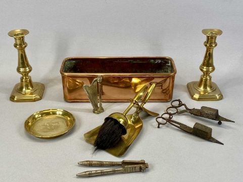CARVED / TURNED ORNAMENTS ETC including Edwardian oak smokers cabinet, single glazed door over drawer with brass drop handle, 26cms (h), oak candle sticks with circular bases and barley twist columns a pair, 27cms (h), two large turned wood fruit bowls, pair of Victorian brass candlesticks 18cms (h) etc.Provenance: private collection Denbighshire