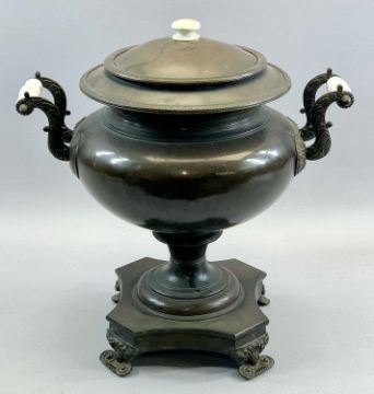 REGENCY COPPER SAMOVAR having a circular body, opaque glass side handles with scroll brackets, brass tap, waisted stem to the square base with concave sides, 40cms HProvenance: private collection Conwy