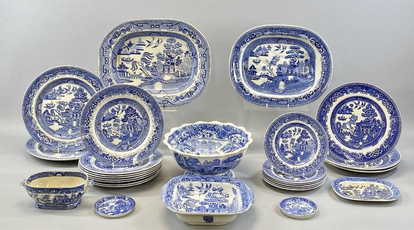 A MIXED GROUP OF BLUE & WHITE TRANSFER DECORATED CERAMICS (19th century and later), including willow pattern oval meat plate with gravy well, 25.5 x 32cms, similar oval meat plate, 27 x 34cms, various willow pattern plates and a Copeland Spode Italian pattern circular bowl, 25.5cms (diam.)Provenance private collection Denbighshire