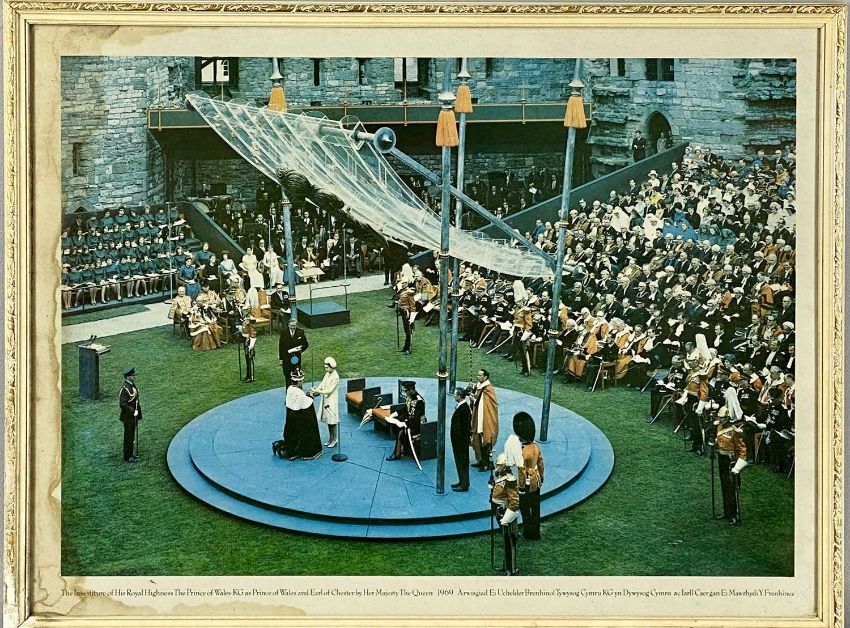 GROUP OF PAINTINGS & OTHER ITEMS, J. C. Morris (British 19th century) oil on canvas, sheep and lambs in mountainous landscape, signed lower right, 50 x 75cms, colour photograph of the investiture of the Prince of Wales 1969, rectangular framed mirror etc. Provenance: private collection Conwy