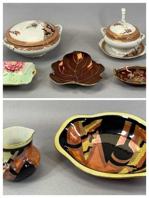 CARLTON WARE JAZZ STITCH PATTERN JUG, printed and painted with a geometric design in yellow, orange and black on mottled orange lustre ground, 5 (h) x 16 (w) x 8cms (d), black printed mark, similar jug, 9cms (h), Rouge Royal oval lugged dish, 17.5 x 11cms, Rouge Royal leaf shaped dish, 22 x 20cms with a Burleigh ware two handled dish, 17.5cms x 13.5cms and Burleigh Ware circular lidded two handled tureen and matching smaller tureen on stand with ladleProvenance: private collection Conwy