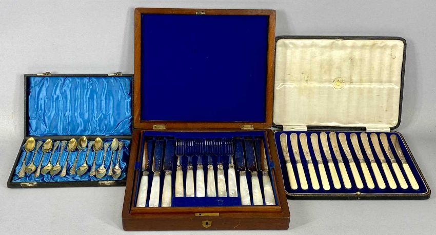 THREE CASED SETS OF SILVER & OTHER CUTLERY, comprising set of 12 silver bladed fruit knives, Sheffield 1923 to the blades, 1922 to the ferrules, xylonite handles, 16.25cms (l), mahogany cased set of 12 EPNS and mother of pearl handled fruit knives and forks, 21cms (l) the knives, continental set of 12 tea/coffee spoons, twist stems, stamped 800 to the bowlsProvenance: private collection Gwynedd