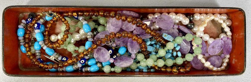 SEMI-PRECIOUS & OTHER JEWELLERY to include single strand cultured pearl necklace, 68 uniform size pearls, 7mm approx., base metal clasp, 61cms (l), amber necklace and bracelet, 36.6gms gross, foil glass beads necklace with 9ct gold clasp, venetian glass, amethyst and other stones etc. in a vintage papier mache and lacquerware glove box and modern jewellery boxProvenance: deceased estate Conwy
