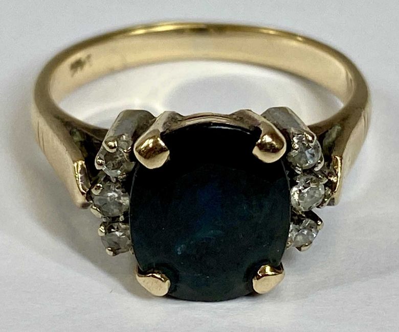 TWO 14CT GOLD DIAMOND & BLUE SAPPHIRE SET DRESS RINGS, the first with sixteen small diamonds shouldering a facet cut blue sapphire, oval open cage back, size P, the other with claw mounted facet cut blue sapphire, three diamonds to each raised shoulder, size L, 7gms grossProvenance: private collection Cheshire