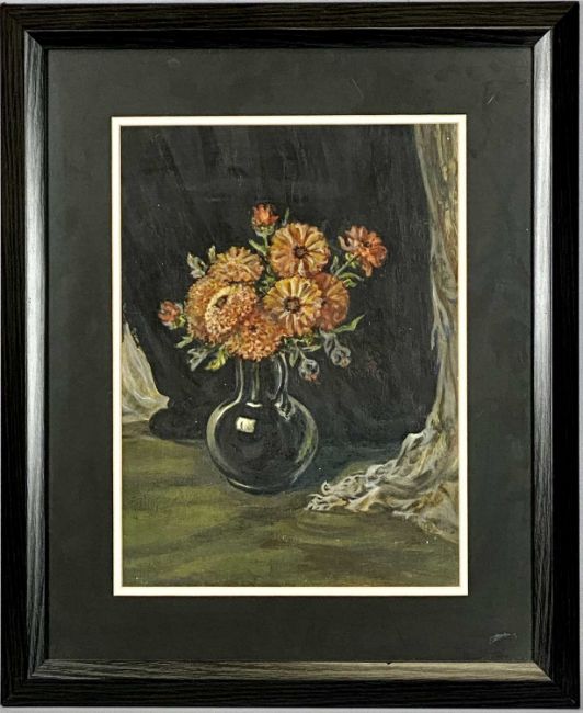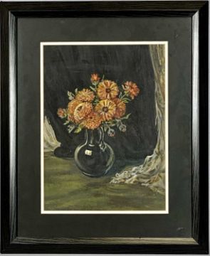 MOSS WILLIAMS polymer on paper - still life vase of flowers, Royal Cambrian Academy of Art label verso, titled "Marigolds in a Black Glass Jug", 36 x 26.5cmsProvenance: private collection CaernarfonshireComments: framed and glazed
