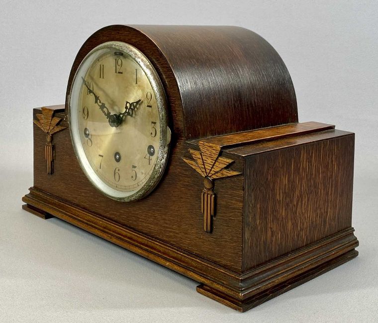 OAK CASED DOME TOP MANTEL CLOCK 1930s, silvered dial with Arabic numerals, quarter striking Westminster/Whittington chimes, 23 (h) x 35 (w) x 17.5cms (d)Provenance: private collection DenbighshireComments: newspaper cutting to inside of door, Rhyl Managers Retirement Mr Earnest Jones Williams of Lake Avenue Rhyl Retirement Gift after 52 years service at W H Smith & Sons