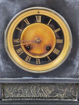 LATE 19TH CENTURY BLACK SLATE ARCITECTURAL MANTEL CLOCK the circular dial with Roman numerals, flanked by thermometer dial and barometer dial, 8 day movement, striking on a gong, 34 (h) x 43 (w) x 17cms (d)Provenance: private collection Conwy