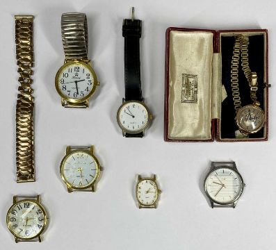 9CT GOLD CASED & OTHER WATCHES, COINS & COLLECTABLES to include a 15 jewel 9ct gold cased lady's wristwatch, silvered dial, Arabic numerals, rolled gold bracelet, 25mm case diameter, 18gms gross, various other fashion watches, 1844 Victoria young head silver crown and other coinage, R.M.I.B steward medallion in original box, etc.Provenance: deceased estate Denbighshire