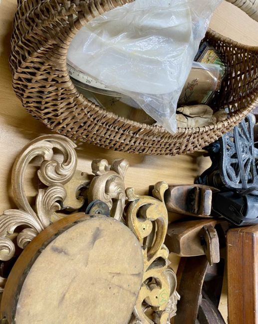 GROUP OF MISCELLANEOUS ITEMS, including vintage woodworking planes, oak barley twist candle sticks a pair, 20cms (h), vintage wicker basket, binoculars, opera glasses and other itemsProvenance: private collection Conwy