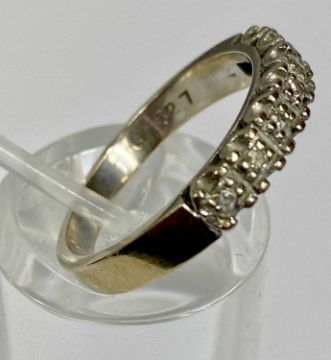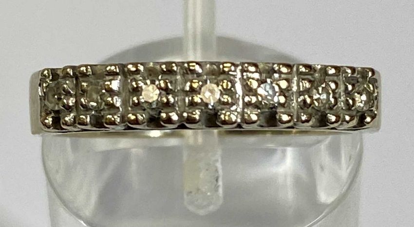 18CT GOLD DIAMOND RING, seven small illusion-set line of stones to a wide band, mid N-O, 4.4gmsProvenance: private collection Cheshire