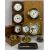 MARINE TYPE INSTRUMENTS, including reproduction brass cased ship's compass mounted on gimbal in brass bound hardwood box with brass anchor to the hinged cover, 8 (h) x 10.5 (w) x 10.5cms (d), reproduction brass cased desk clock, mounted on gimbal, 19cms (h), ships type clock and tide gauge mounted on wooden shield, vintage airplane type pinnacle compass, 7cms (diam.), etc.Provenance; private collection Conwy