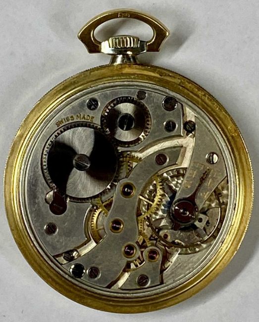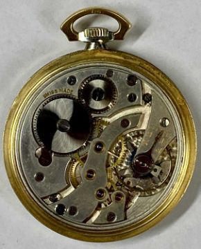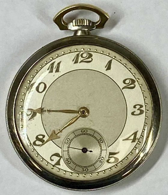 ART DECO STYLE SLIM CASED 18CT GOLD PRESENTATION POCKET WATCH, two tone dial, stylised Arabic numerals, subsidiary seconds dial, Swiss made jewelled movement, working order when listed, two tone case numbered to the back interior 152314, stamped 18 and 0.75 in various places, inscription to case back reads "Presented to Alfred Dearburg in appreciation of 21 years service as secretary of Wilton Lawn Tennis Club 1931", 43mms case diameter, 49.5gms gross complete Provenance: private collection Wrexham