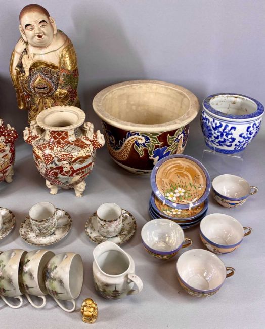 MIXED GROUP OF ORIENTAL CERAMICS, including a Satsuma Earthenware Hotei Buddha, 35cms (h), Satsuma vases a pair, 22.5cms (h), Imari bowl with scalloped rim, 18.5cms (diam.), egg shell part tea service and other items Provenance: deceased estate Denbighshire