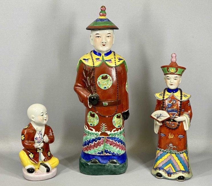 CHINESE STATUES (3), Earthenware figure of a Mandarin dignitary, colourful polychrome decoration, 58cms (h), similar smaller figure, 43cms (h) and a figure of a young boy holding a vase, 26cms (h)Provenance: private collection Gwynedd