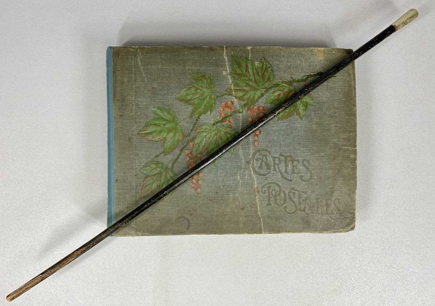 ALBUM OF OVER 240 ANTIQUE & VINTAGE POSTCARDS, various subjects, WWI, including silks, French greeting and souvenir, together with an ebonised swagger stick, the nickel cap with military badge Provenance: private collection Gwynedd