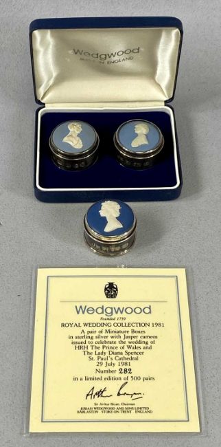 THREE HALLMARKED SILVER WEDGWOOD JASPERWARE CAMEO CIRCULAR LIDDED BOXES, Queen Elizabeth II numbered to the base 282 from a limited edition of 500, Lady Diana Spencer numbered 282 from a limited edition of 500, both Birmingham 1981 and HRH Prince of Wales numbered 220 from a limited edition of 1000, London 1977, maker Josiah Wedgwood & Sons Limited, presentation box to fit two with certificate for Diana and Prince Charles pair, but the present pair non matching Provenance: private collection Wrexham