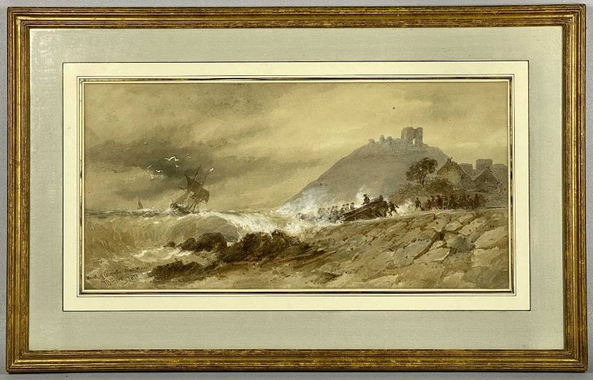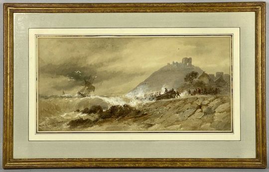 ‡ THOMAS BUSH HARDY (1842 - 1897) watercolour - entitled verso "Wreck off Criccieth, North Wales", signed and dated 1871 lower left, retail label for Susanna Soames and Athena Strutt verso, 24 x 49cmsProvenance: private collection DenbighshireComments: framed and glazed