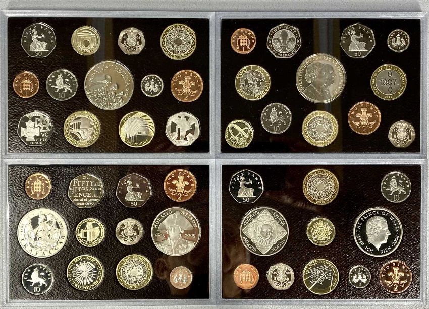 ROYAL MINT UNITED KINGDOM PROOF COIN SETS 2005 - 2012 COMPLETE, including the 2009 rare Kew Gardens 50p coin set, all in original boxes, with certificates and outer slip boxes Provenance: private collection Gwynedd