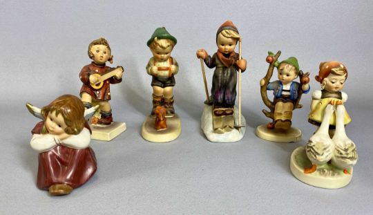 COLLECTION OF SIX HUMMEL FIGURES, including Skier, Happiness, Sensitive, Hunter and Goose Girl with seven Hummel miniature year plates, 8.5cms (diam.)Provenance: private collection Denbighshire