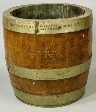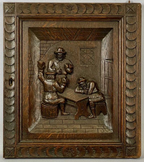 RELIEF PANEL & COOPERED OAK HALF BARREL, one barrel hoop stamped Peter Walker & Son, Warrington & Burton Limited 816, 30 (h) x 30cms (diam.) and Continental carved oak panel, in relief with figures in tavern scene, 41.5 x 37cms