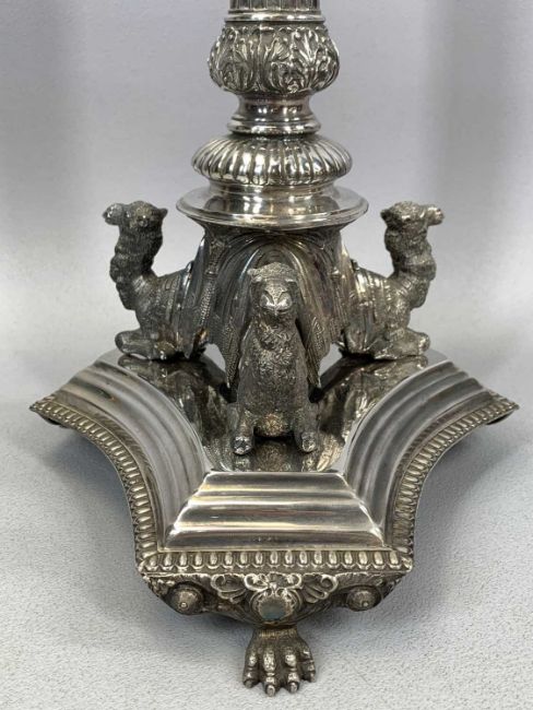 WALKER & HALL SILVER PLATED OIL LAMP, trefoil base, paw feet, stepped platform, three recumbent camels and drapery, acanthus column base and cap detail, fluted column, floral etched glass font and matching globular shade, plated wick cage, Evered & Co wick turners, boxed Aladdin additional lamp chimney, 85cms (overall h)Provenance: private collection Gwynedd