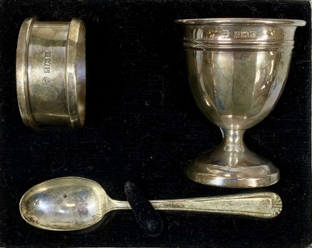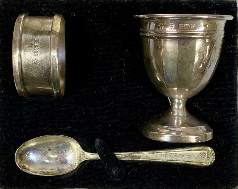 SMALL SILVER/WHITE METAL SELECTION, comprising cased three piece egg cup, napkin ring and spoon set, Birmingham 1959, Barker Brothers Silver Limited, 6.25cms (h) the egg cup, Victorian mustard spoon, London 1850, indistinct makers mark, pair of salt spoons, Birmingham 1914, Barrett & Thompson, 10.25 and 8cms (l) respectively, Indian white metal sauce boat, serpent form handle, double bordered leaf decoration, no visible marks, 5.25cms (max. h), 15cms (across), 2.5ozt weighableProvenance: private collection Denbighshire