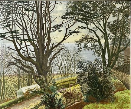 ‡ FELICITY CHARLTON oil on board - sea view through garden with greenhouse in foreground, 50 x 60cmsProvenance: private collection Denbighshire Comments: framed