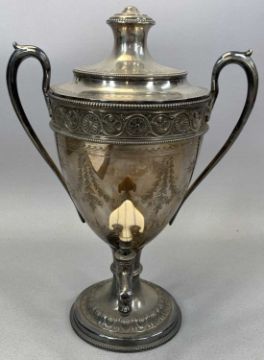 ELKINGTON & CO SILVER PLATED SAMOVAR twin handled classical urn form, embossed and chase decorated, circular base, ivory tap and inner heat shield, 32cms (overall h), 23.5 (w)Provenance: private collection GwyneddGOV.UK Ivory content- to comply with current regulation - self-declaration form completed for the sale of this item - Submission reference PSGJP62R