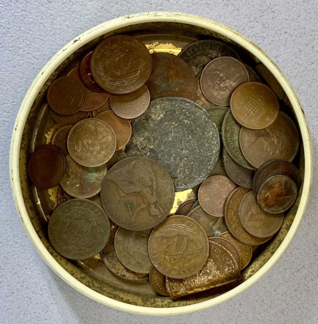 BRITISH AND OVERSEAS COINS, COLLECTABLES, METAL DETECTOR FINDS ETC, mainly within a vintage tin cashboxProvenance: deceased estate Conwy