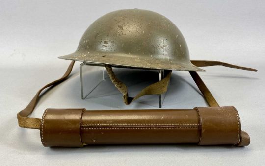 BRITISH MILITARIA WWII PERIOD ARMY HELMET, stamped 1939, and a Broadhurst Clarkson & Co. leather cased three-drawer telescope with leather strap and lens caps, 27cms L (closed)