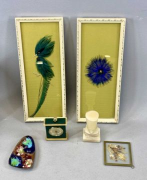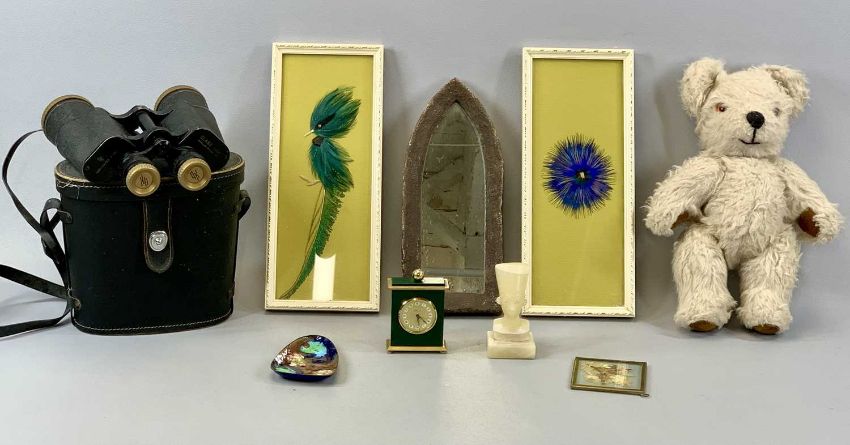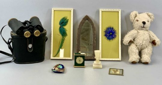 VARIOUS ITEMS including Glanz 7x50 binoculars with case, a Looping Swiss 8-day alarm clock, 10cms (h), feather collage pictures, a pair, 31 x 11cms etc.Provenance: deceased estate Gwynedd