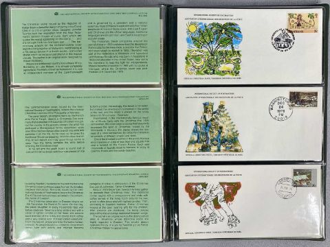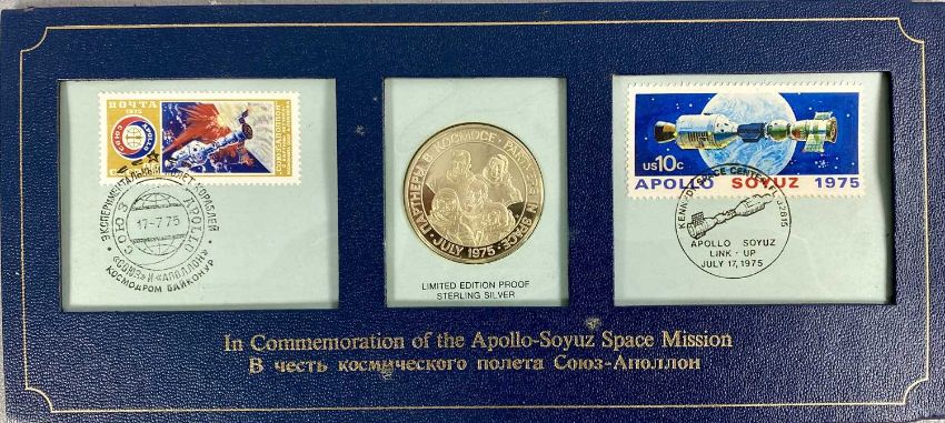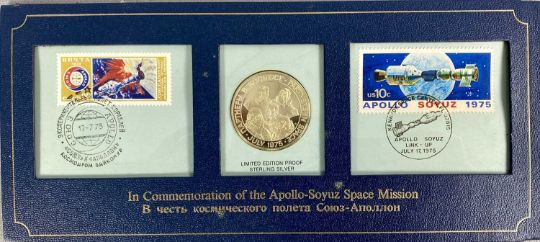 STAMP / COIN SETS including Franklin Philatelic International Society Postmasters 1976 Christmas Stamps of the World Commemorative Collection, Apollo-Soyuz Space Mission Sterling Silver proof medal and stamp set and The Day of Concorde Sterling Silver medal commemorative issue