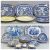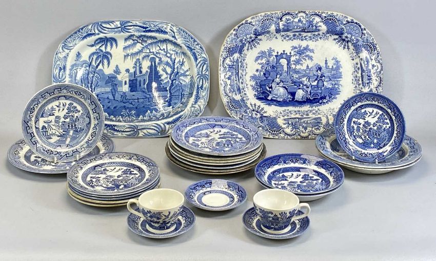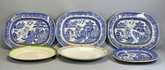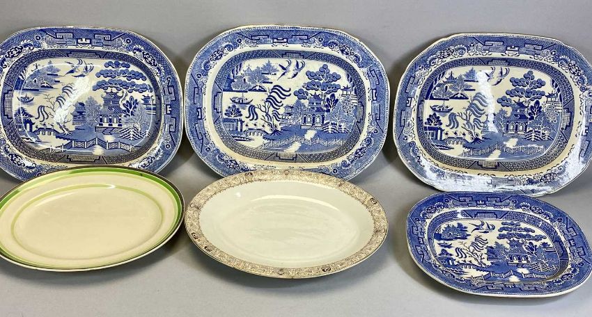 ANTIQUE STAFFORDSHIRE BLUE & WHITE TRANSFER DECORATED MEAT PLATES, William Davenport 'Chinese Ruins' pattern, 33 x 43cms, 'Spanish Beauties' pattern, 35.5 x 45cms, 3 x Willow pattern, 35.5 x 45cms, similar plates and other items