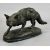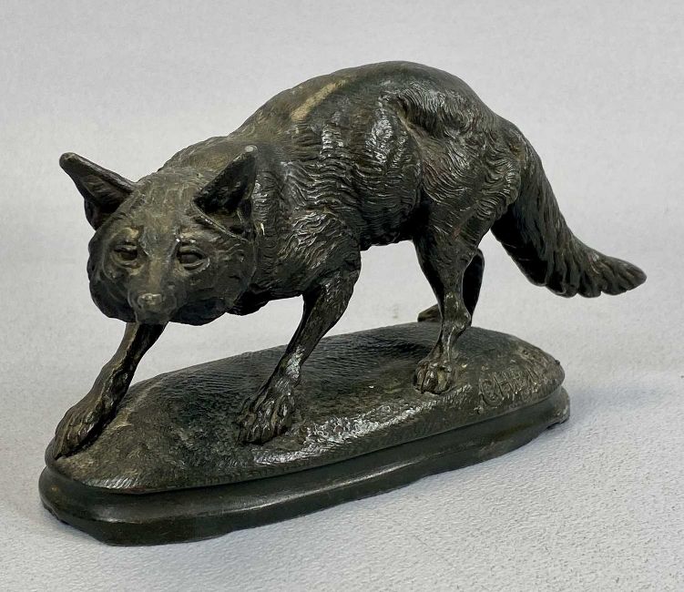 METAL WARE GROUP comprising (1) pair 18th Century brass candle sticks with broad circular bases 21cms H, (2) spelter figure of a crouching fox, 16cms L and (3) a Verdigris finish metal figure of a crouching hare, 14cms LProvenance: private collection Ynys Mon