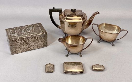 GROUP OF SMALL SILVER & OTHER ITEMS including George V silver cigarette case, Birmingham 1918, 8.5 x 6.5cms, Edward VII silver Sovereign / Half Sovereign case, scroll engraved decoration, Birmingham 1901, 5 x 3cms (excl. suspension loop), Victorian silver vesta case, engraved leaves, monogrammed cartouche, Birmingham 1887, 4 x 3.5cms (excl. suspension loop), a pewter clad Arts & Crafts cigarette box, hammered body, hinged cover embossed with a Liver Bird and capital 'H', 8cms H, 17cms W, 10cms D, Mappin & Webb Princes Plate three-piece tea service, panelled octagonal form standing on pad feet, the teapot with ebony handle and finial, 15cms H